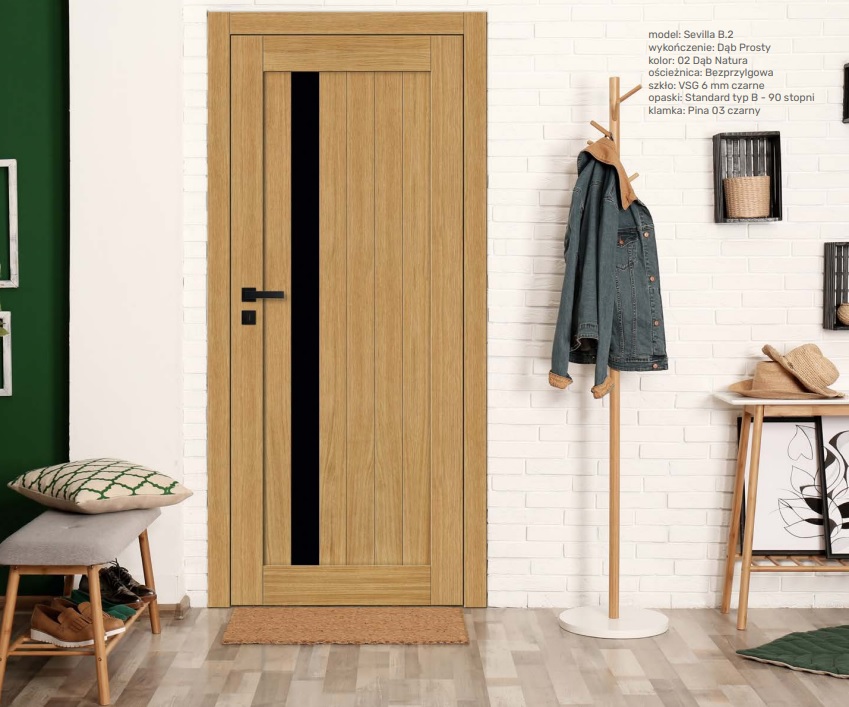Linia SEVILLA - konstrukcja skrzydeł tej linii oparta jest na minimaliźmie. Widoczne jest to zarówno w prostych płycinach oraz w ich połączeniu z ramą drzwi, która pozbawiona jest listew ozdobnych. Dzięki temu drzwi wyglądają nowocześnie i lekko.